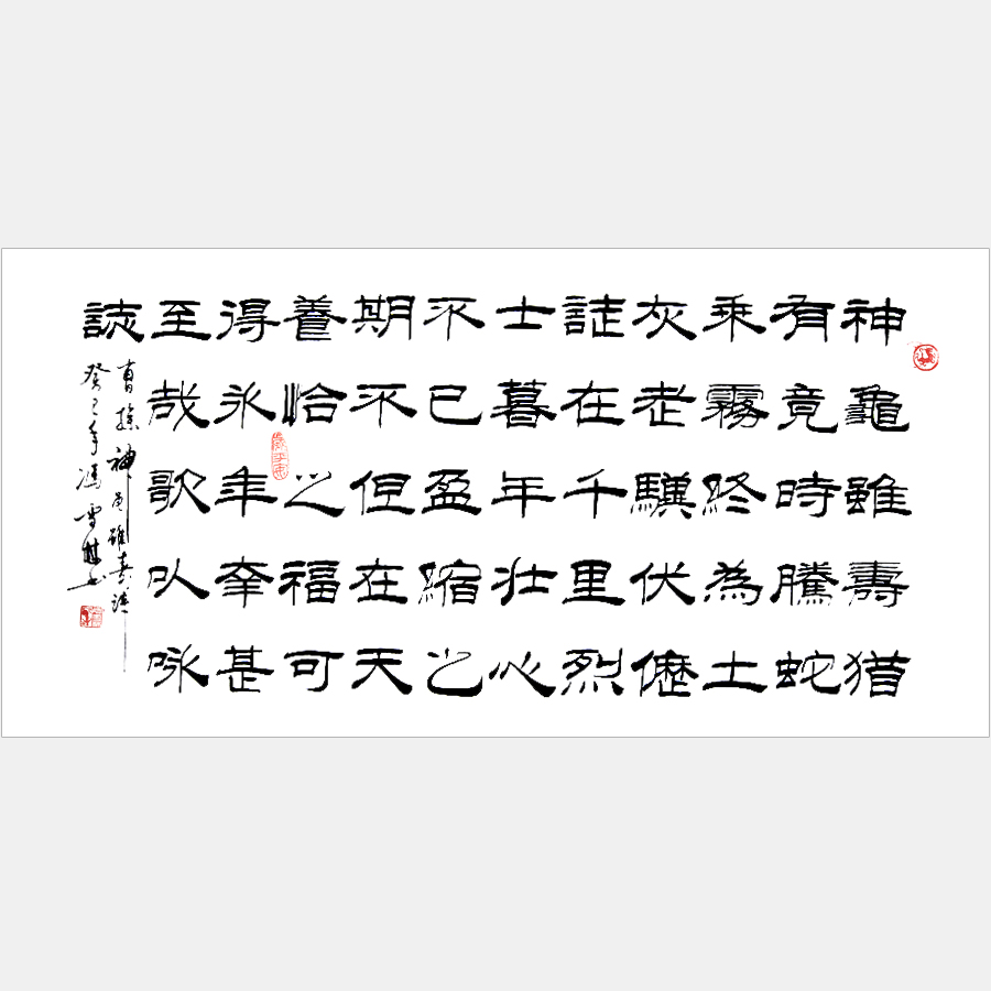 書法點評:馮雪林的書法風格中既有“漢隸碑帖”的遒媚典雅又有曹全碑的奇崛豪邁,還有各代隸書派的率真狂放,正所謂“囊括萬殊而裁成一相”。馮雪林夢追晉人,擇化簡牘,對“二王”書法的梳理與實踐,對晉人書跡的關照與詮釋,使他的書法藝術走上了通衡大道,其書法語言似無跡可尋,卻又似曾相識,其創作的廣度與厚度與此可見一斑……此處欣賞到的馮雪林書作為曹操的一張經典名片詩句《龜雖壽》一首,通篇筆墨恣肆激蕩,清秀溫柔,靈動飛揚,顯課意趣盎然。——中國美術學院教授沈賜恩