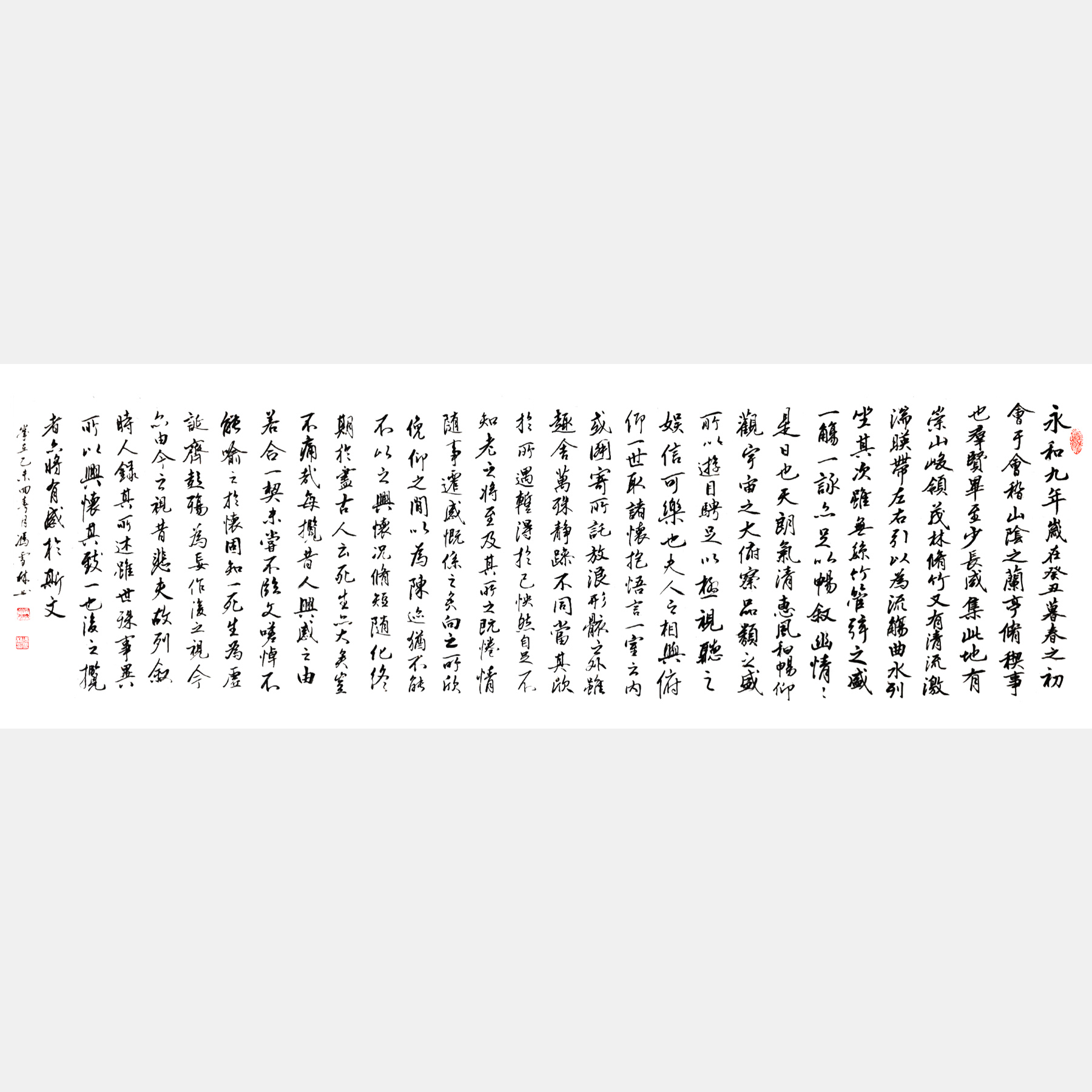 永和九年,歲在癸丑,暮春之初,會于會稽山陰之蘭亭,修禊事也。群賢畢至,少長咸集。此地有崇山峻嶺,茂林修竹;又有清流激湍,映帶左右,引以為流觴曲水,列坐其次。雖無絲竹管弦之盛,一觴一詠,亦足以暢敘幽情。是日也,天朗氣清,惠風和暢,仰觀宇宙之大,俯察品類之盛,所以游目騁懷,足以極視聽之娛,信可樂也。