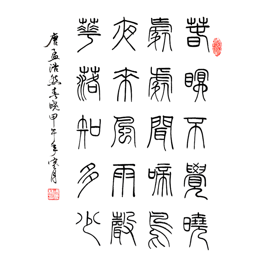 內容解釋:《春曉》是一首著名五言絕句,是唐代詩人孟浩然隱居鹿門山時所作,詩人抓住春天的早晨剛剛醒來時的一瞬間展開聯想,描繪了一幅春天早晨絢麗圖景,抒發了詩人熱愛春天、珍惜春光的美好心情。全詩語言平易淺近,自然天成,言淺意濃,景真情真,深得大自然的真趣。