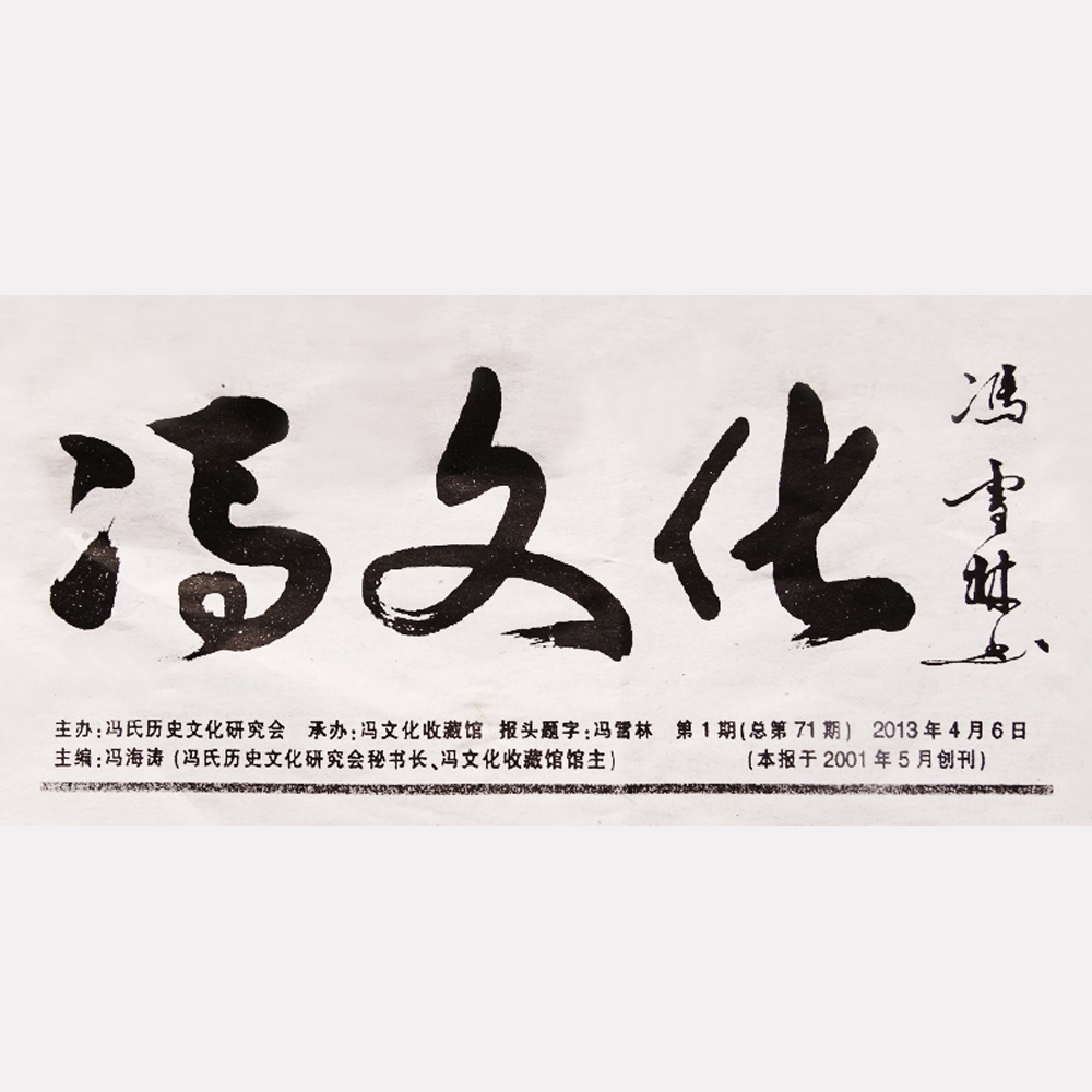 馮雪林先生為馮氏歷史文化研究會報紙《馮文化》題寫報頭。《馮文化》報由馮氏歷史研究會主辦,馮文化收藏館承辦,于2001年5月創刊。