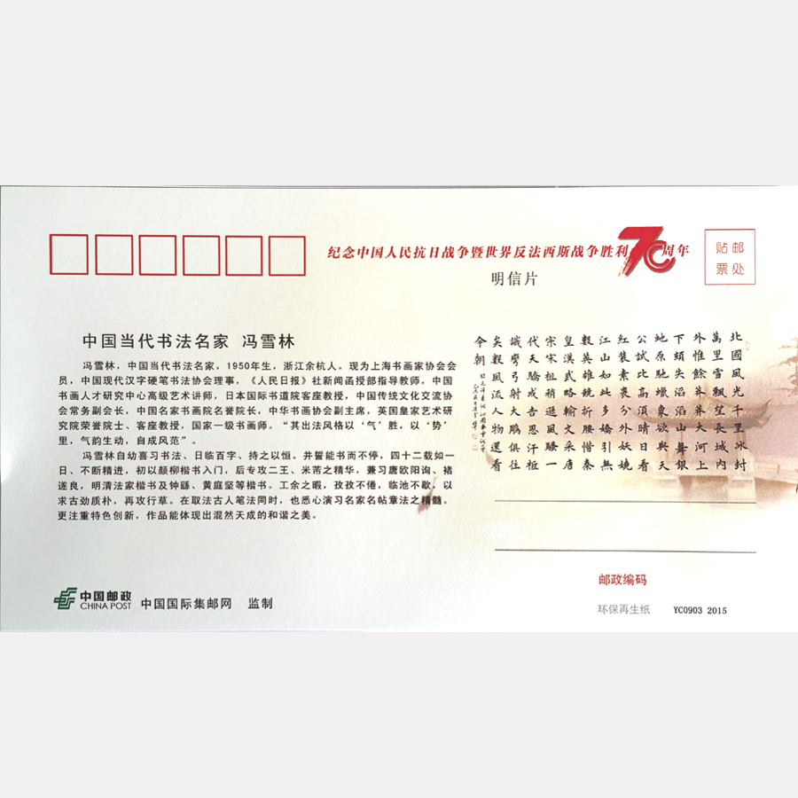 中國當代書法名家馮雪林書藝、紀念中國人民抗日戰爭暨世界反法西斯戰爭勝利70周年明信片