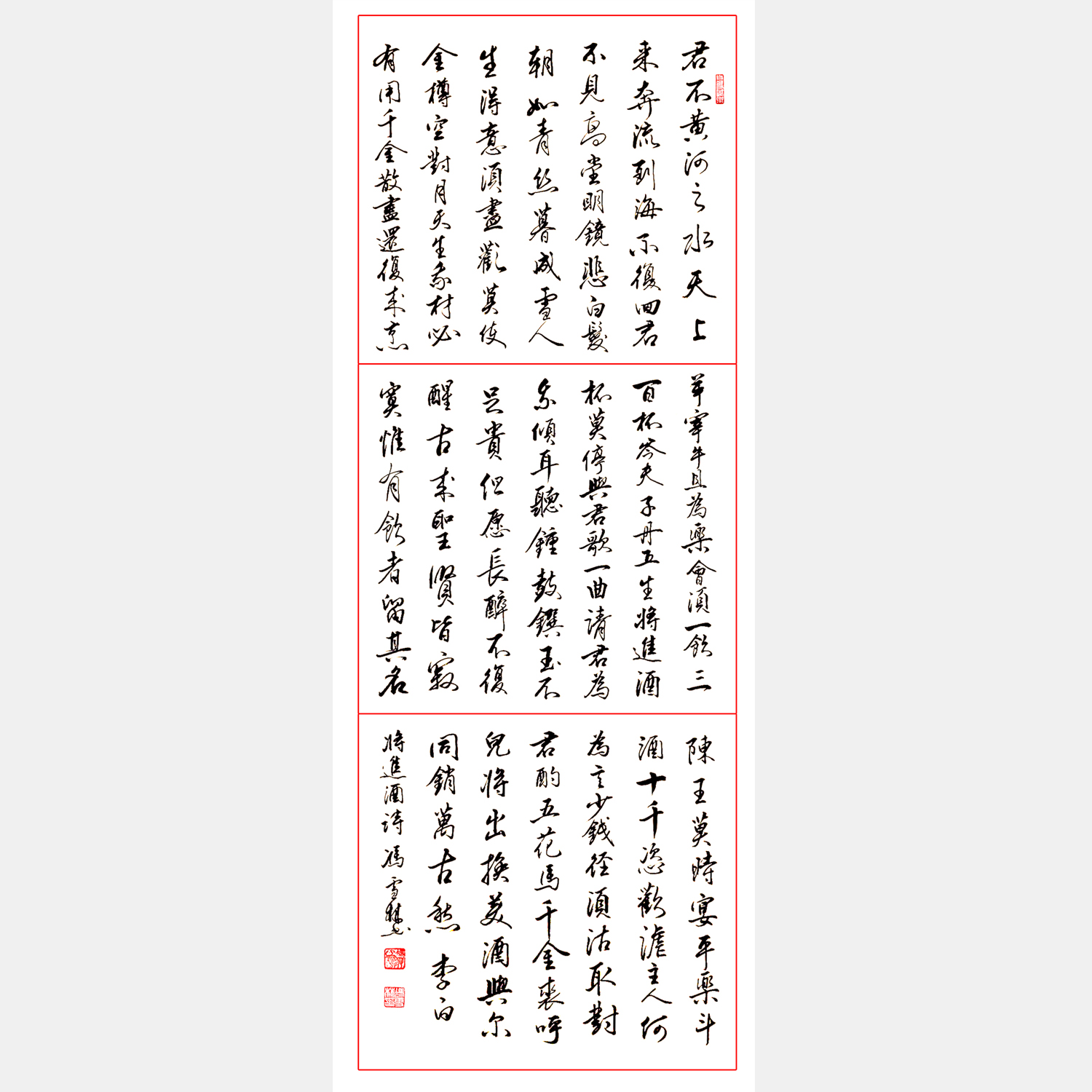 字畫關聯:李白《將進酒》楷書、 李白《將進酒》行書、 李白《靜夜思》行書、 李白《客中行》、 李白《陪族叔刑部侍郎曄及中書賈舍人至游洞庭五首》其一、 李白《春夜洛城聞笛》《蘇臺覽古》