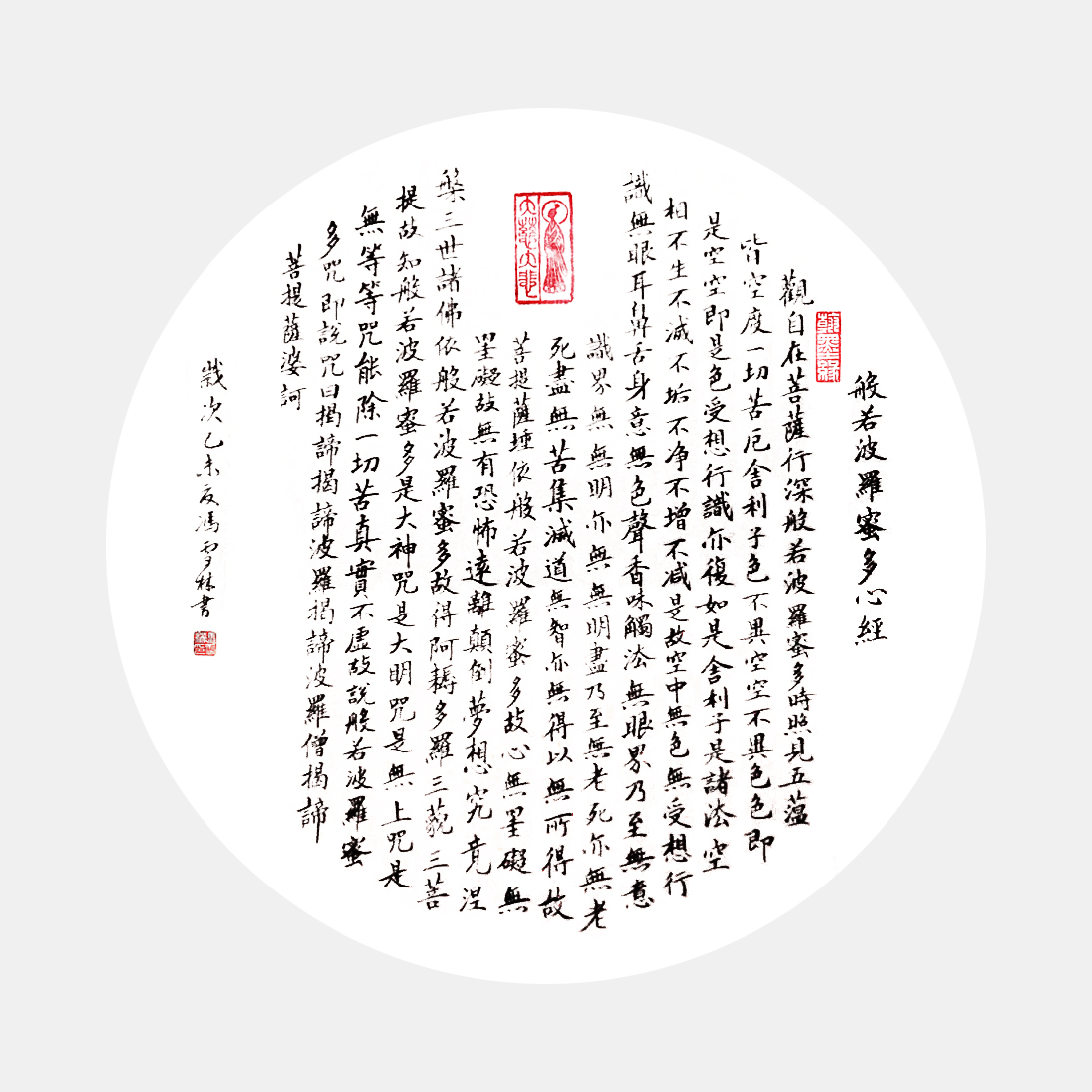 字畫關聯:《般若波羅蜜多心經》楷書圓形扇面、《般若波羅蜜多心經》楷書橫幅長卷 、 無門慧開《平常心是道》 、 六祖惠能大師《菩提偈》 、一花一世界,一葉一菩提。
