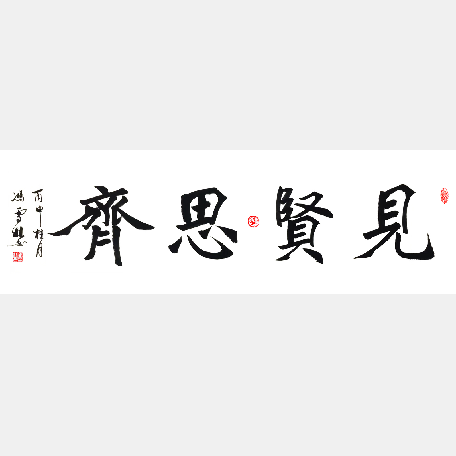 內容解釋:意指見到有才德的人就想著與他齊平。語出自,《論語·里仁》:“子曰:‘見賢思齊焉,見不賢而內自省也。’” 孔穎達疏:“見彼賢則思與之齊等。” 唐駱賓王《靈泉頌》:“見賢思齊,仰圭璋而有地;揮毫興頌,鏤琬琰之無慙。”