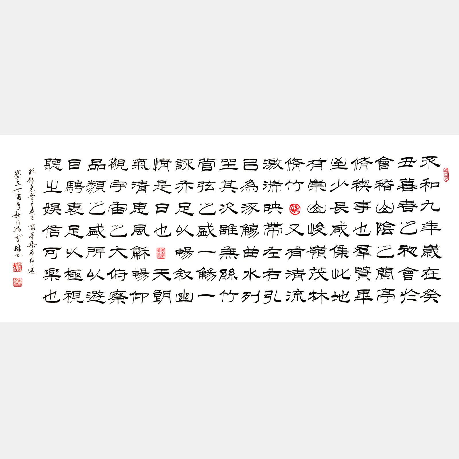 永和九年,歲在癸丑,暮春之初,會于會稽山陰之蘭亭,修禊事也。群賢畢至,少長咸集。此地有崇山峻嶺,茂林修竹;又有清流激湍,映帶左右,引以為流觴曲水,列坐其次。雖無絲竹管弦之盛,一觴一詠,亦足以暢敘幽情。是日也,天朗氣清,惠風和暢,仰觀宇宙之大,俯察品類之盛,所以游目騁懷,足以極視聽之娛,信可樂也。