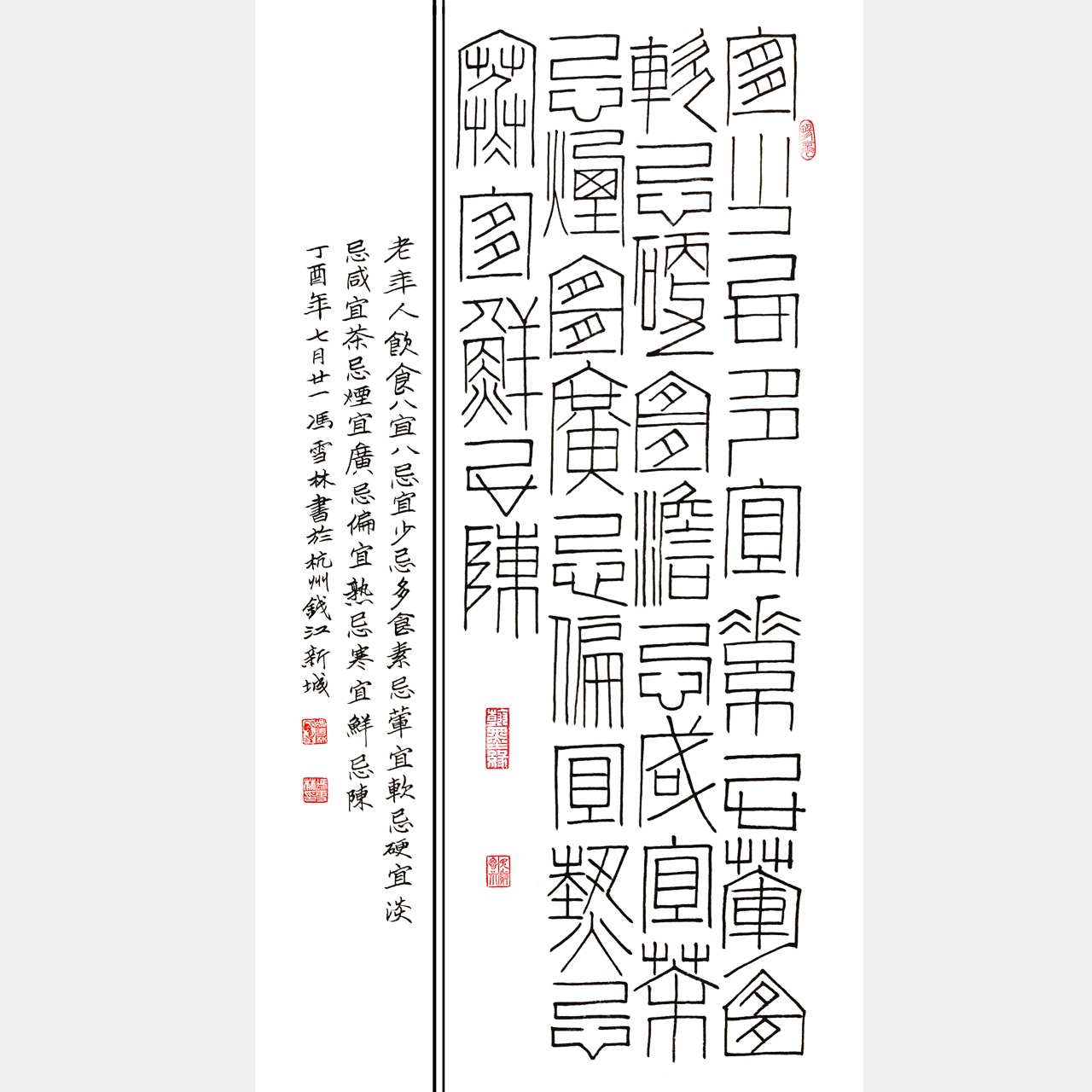 字畫內(nèi)容:老年人飲食“八宜八忌”——宜少忌多、宜素忌葷、宜軟忌硬、宜淡忌咸、宜茶忌煙、宜廣忌偏、宜熱(熟)忌寒、宜鮮忌陳。