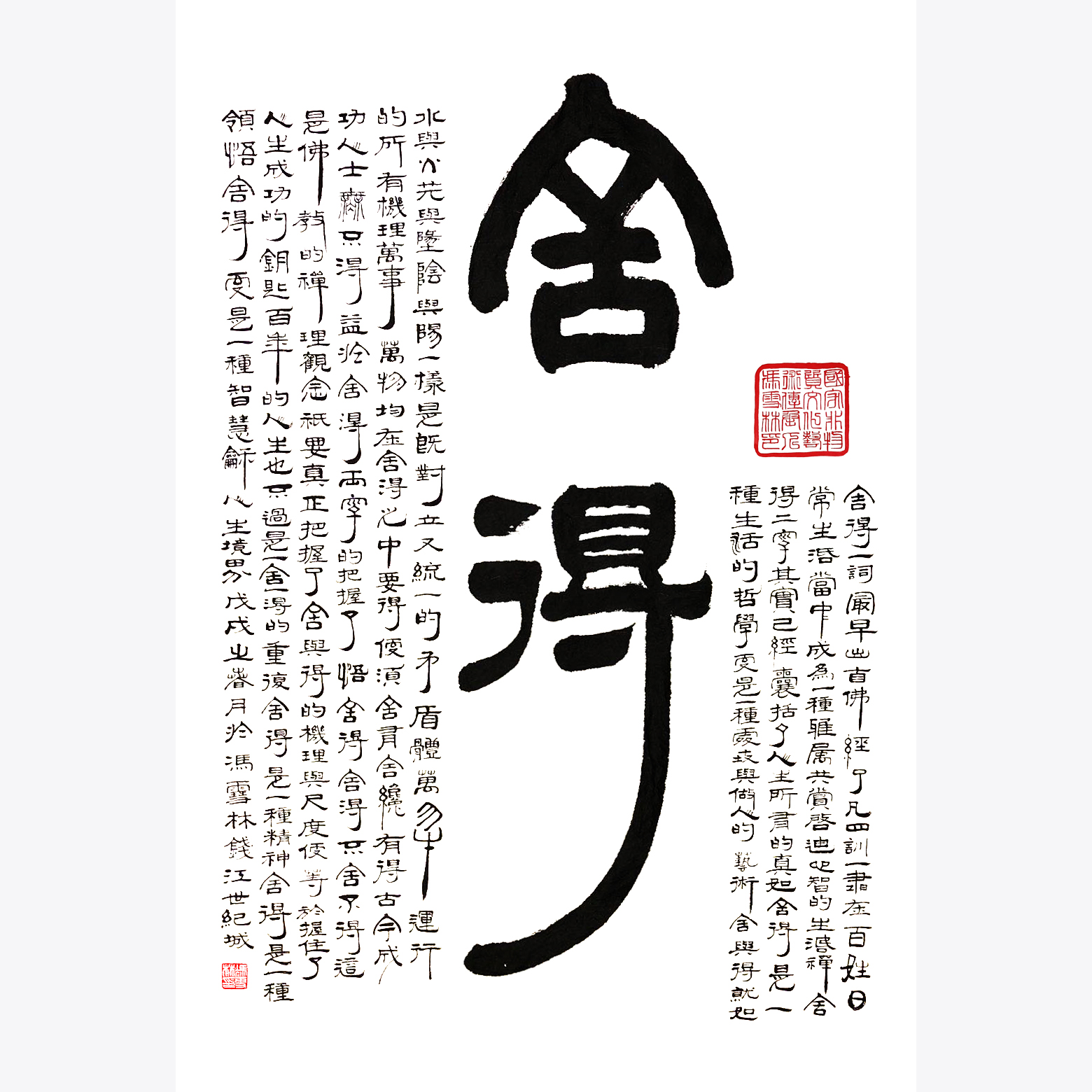 字畫內容:舍得。舍得一詞,最早出自佛經《了凡四訓》。在傳入中國后,迅速與中國傳統的老莊道學思想相互融會,成為“禪”的一種哲理。隨著光陰的流轉,舍得這一禪理,又迅速滲透到了老百姓的日常生活之中,并逐步演進為一種雅俗共賞,啟迪心智的“生活禪”。