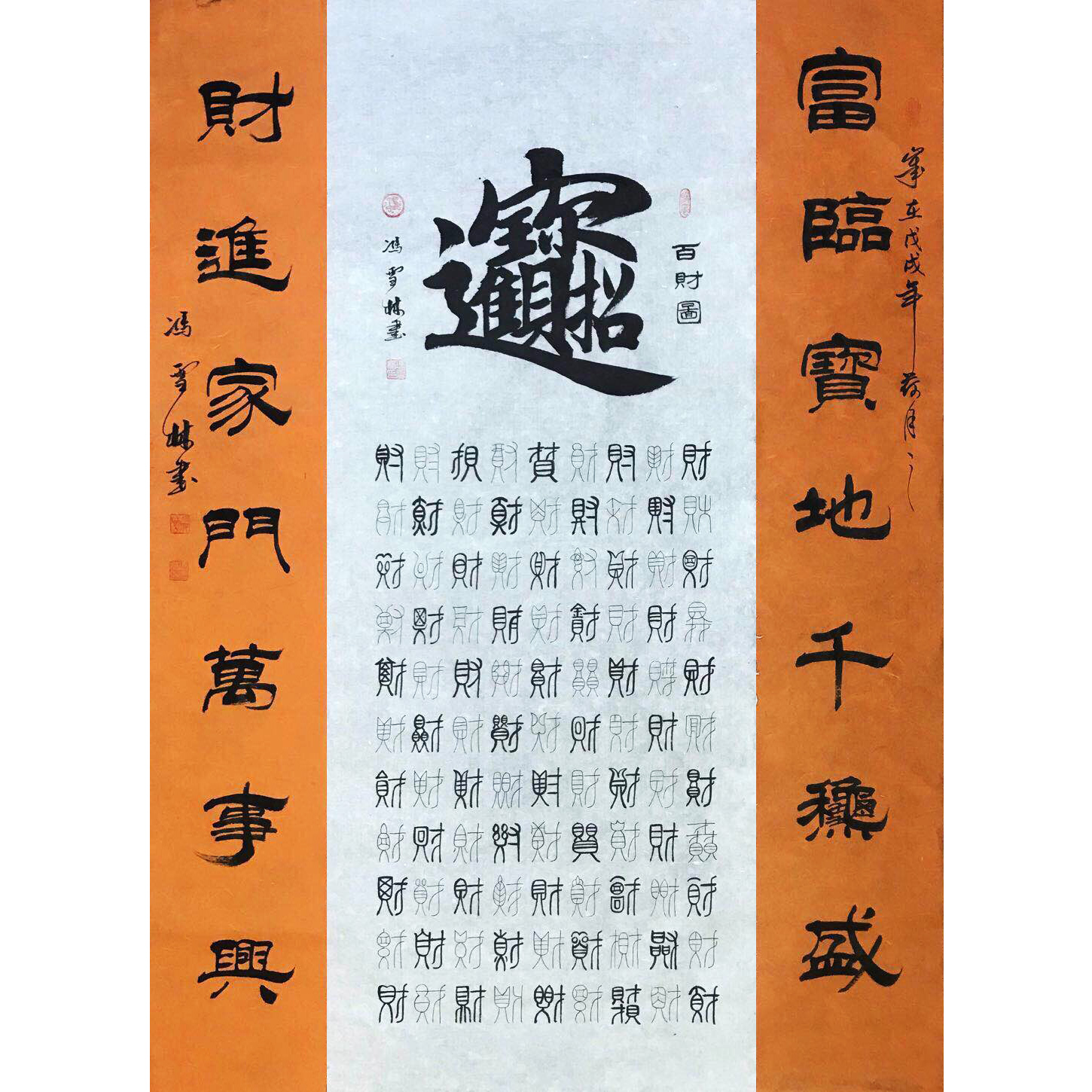 字畫內容:招財進寶合體字。百財圖(由中華文化里100個不同寫法的“財”字書寫而成);富臨寶地千秋盛,財進家門萬事興。