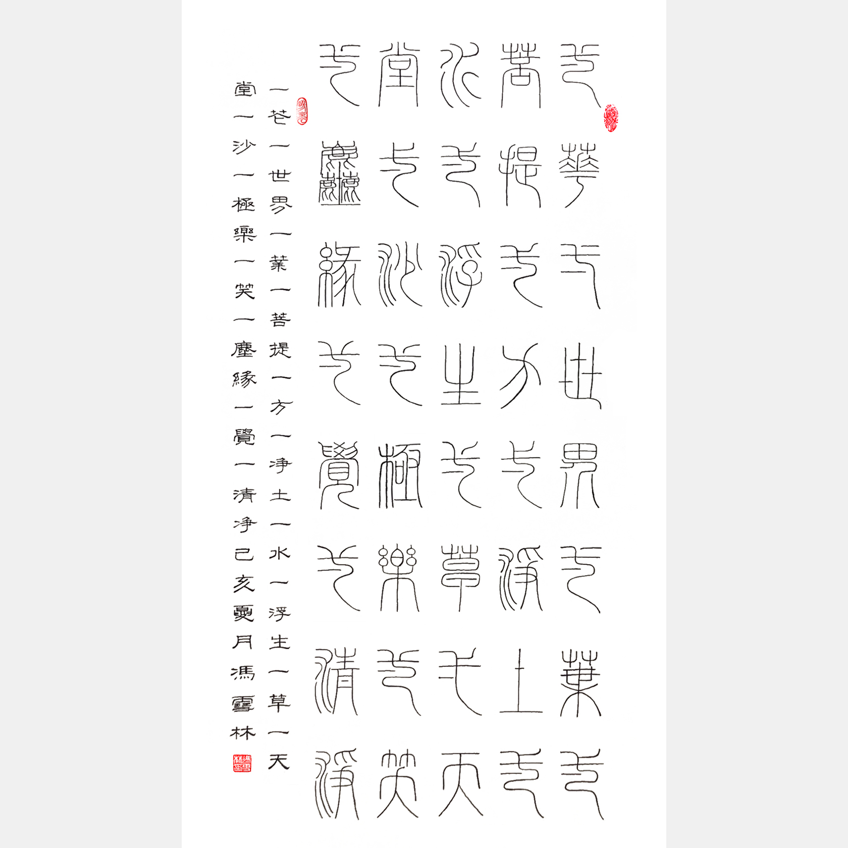 字畫內容:一花一世界,一葉一菩提,一方一凈土,一水一浮生,一草一天堂,一沙一極樂,一笑一塵緣,一覺一清凈。