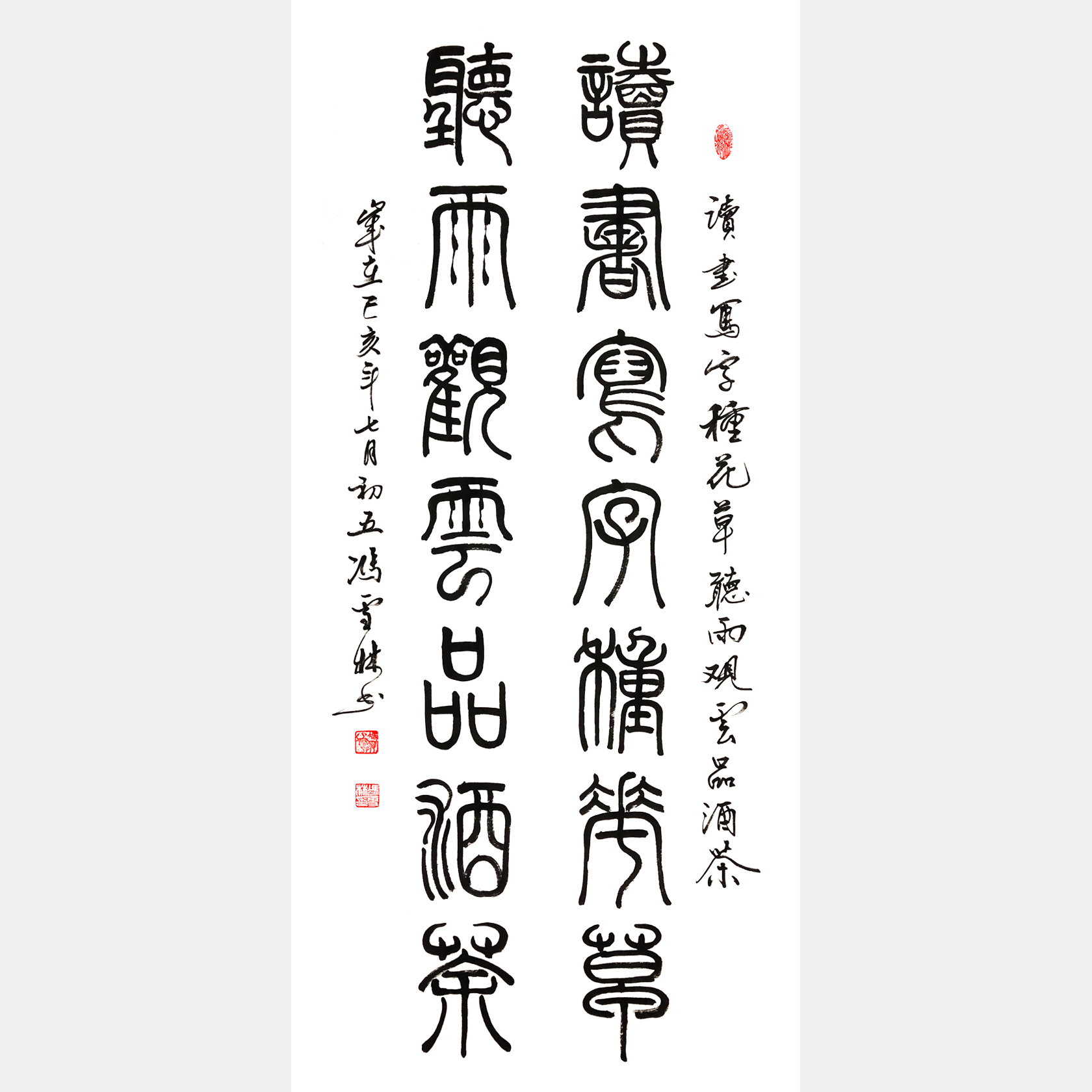 字畫內容:讀書寫字種花草,聽雨觀云品酒茶。
