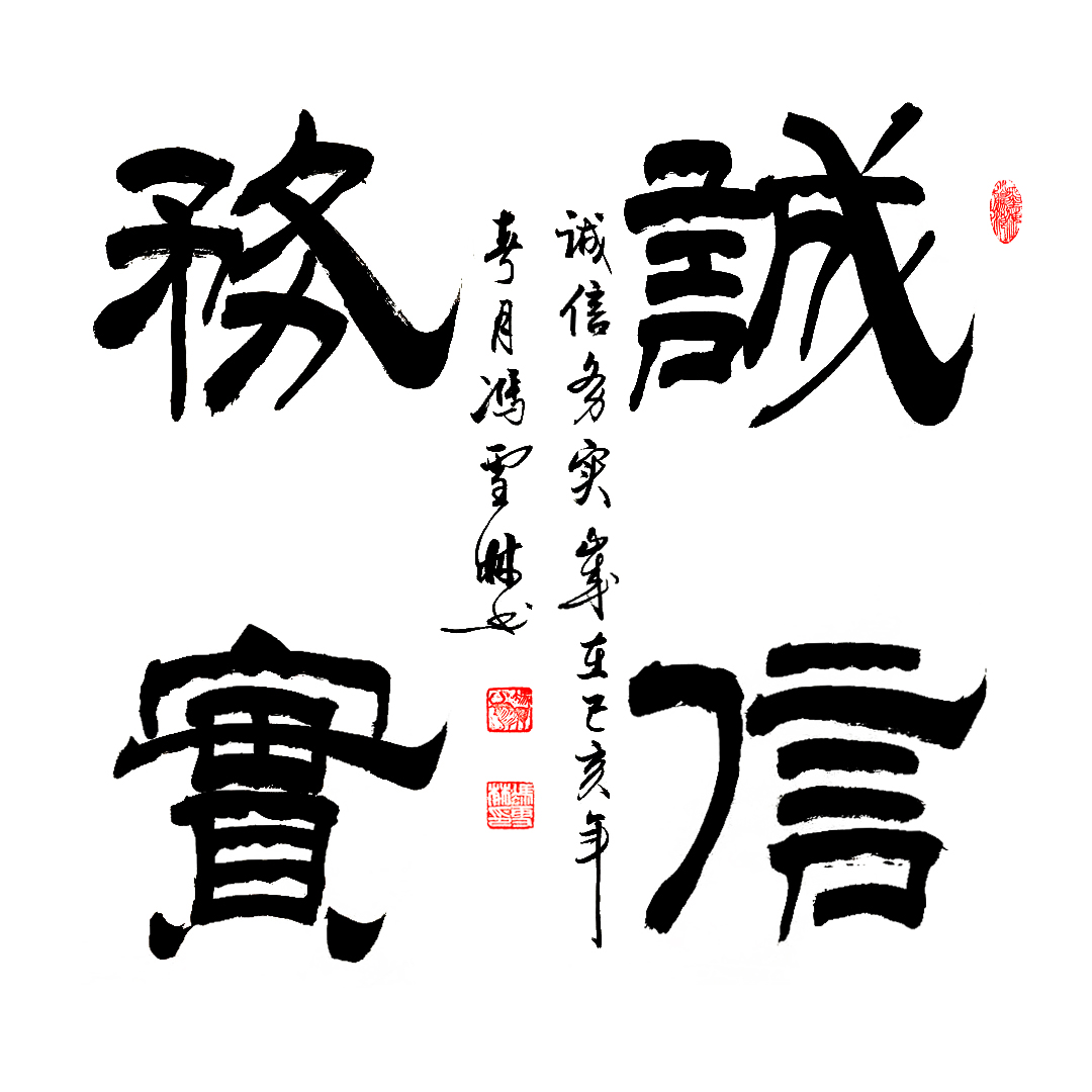 內容解釋:誠信,即待人處事真誠、老實、講信譽。言必行,行必果。一言九鼎,一諾千金。務實,意思是少說多做,真抓實干,腳踏實地做好每一件事情。誠信務實,常用來當作公司標語、企業文化、校訓、人生信條,備受推崇。