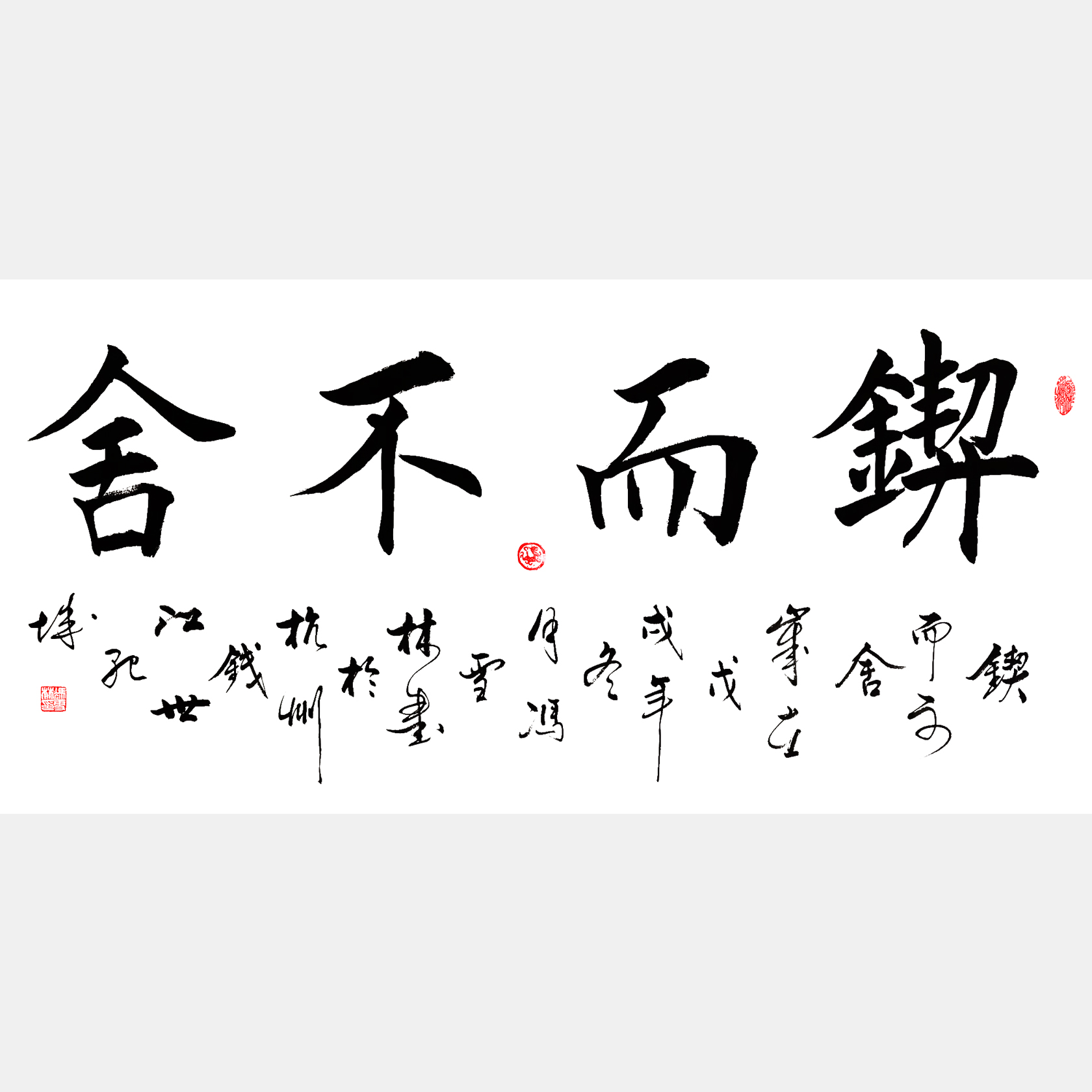 內容解釋:鍥,鏤刻;舍,停止。鍥而不舍,意思是不斷地雕刻,比喻有恒心,有毅力。語出自《荀子·勸學》:“騏驥一躍,不能十步;駑馬十駕,功在不舍。鍥而舍之,朽木不折;鍥而不舍,金石可鏤。”