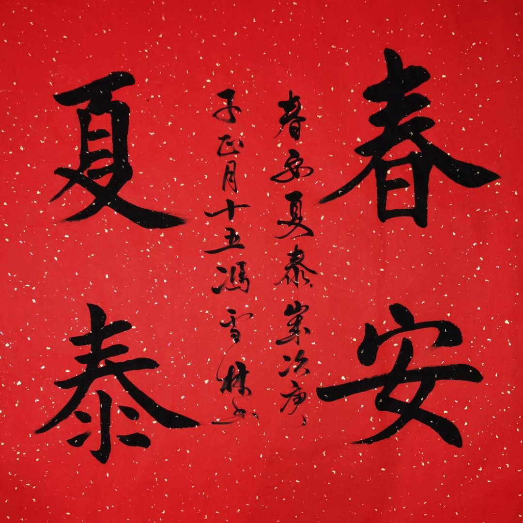 內容解釋:春安夏泰,常與“秋吉冬祥”一起書寫,表達人們對四季安泰、好運常伴的美好生活的期許、向往?!按喊蚕奶币才渥鞔郝?對聯,上聯“春安夏泰人長壽”,下聯“秋福冬祥家進財”。