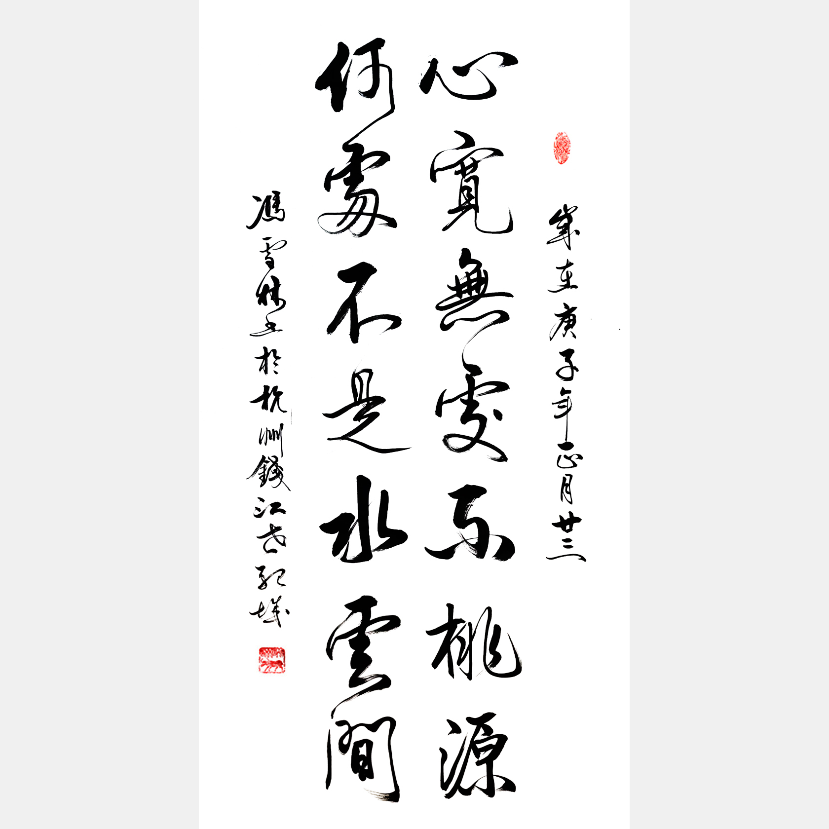 字畫(huà)內(nèi)容:心寬無(wú)處不桃源,何處不是水云間。