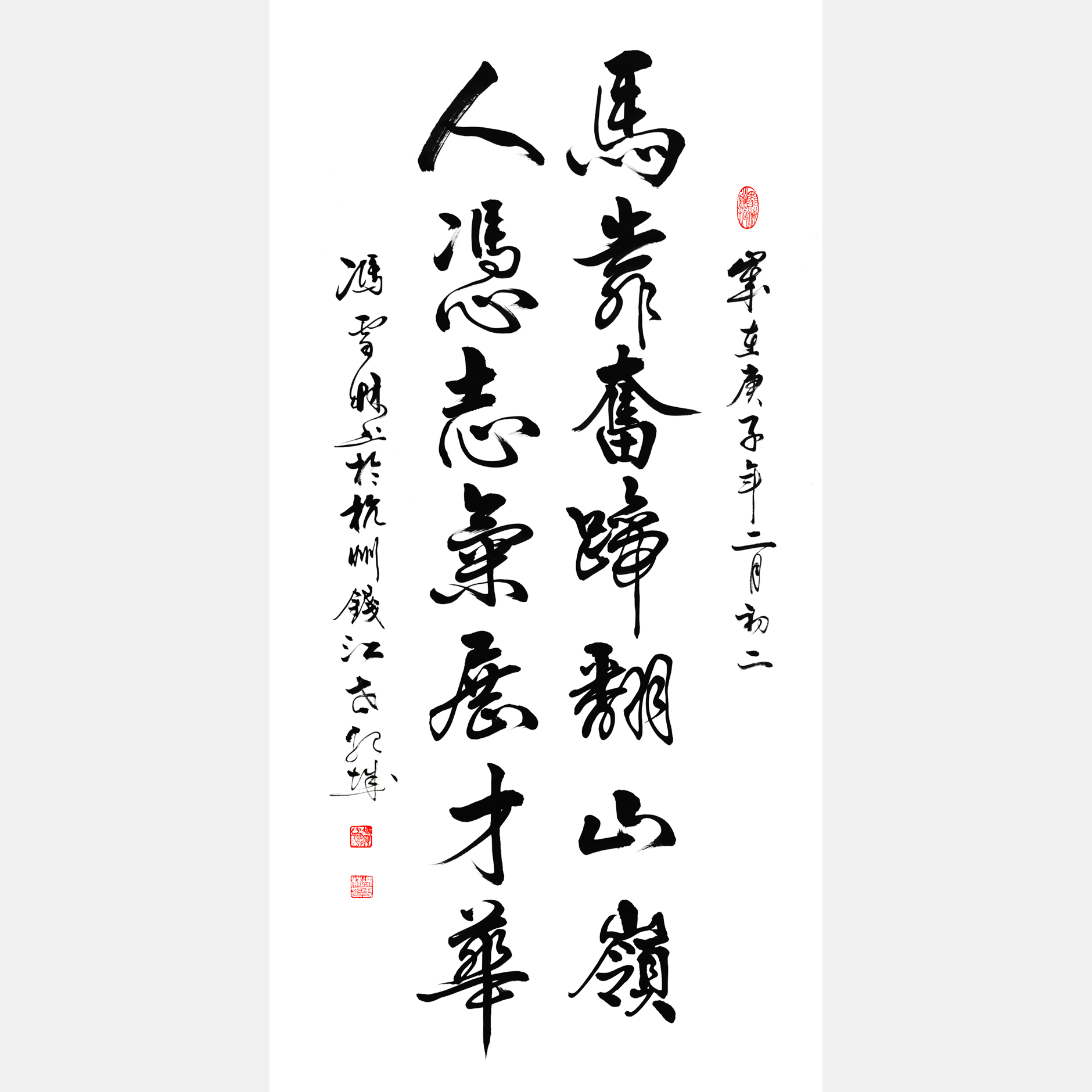 字畫內容:馬靠奮蹄翻山嶺,人憑志氣展才華。