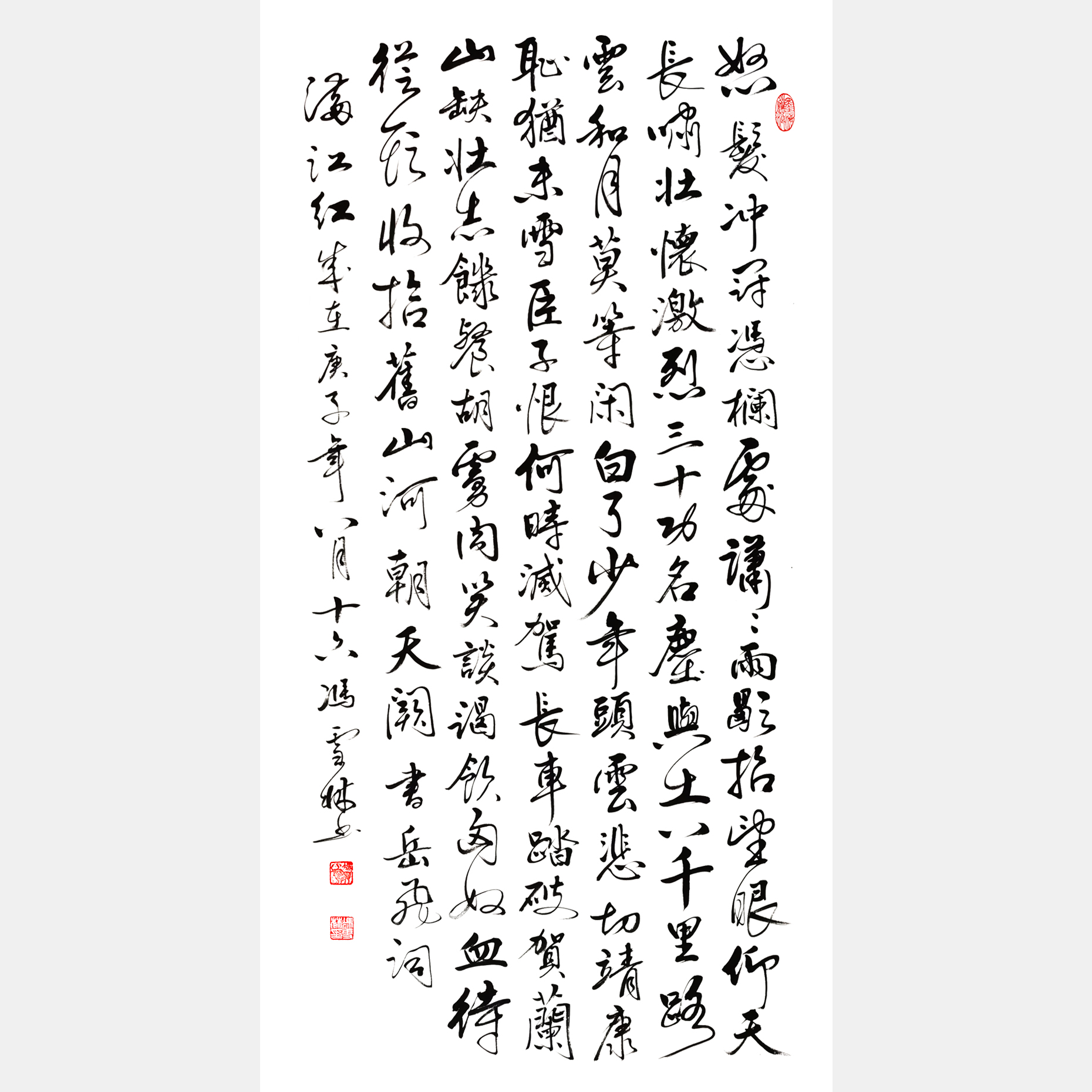 內容解釋:岳飛《滿江紅·怒發沖冠》上片抒寫作者對中原重陷敵手的悲憤,對局勢前功盡棄的痛惜,表達了自己繼續努力爭取壯年立功的心愿;下片抒寫作者對民族敵人的深仇大恨,對祖國統一的殷切愿望,對國家朝廷的赤膽忠誠。全詞情調激昂,慷慨壯烈,顯示出一種浩然正氣和英雄氣質,表現了作者報國立功的信心和樂觀主義精神。岳飛的代表詞作《滿江紅·怒發沖冠》是千古傳誦的愛國名篇。下面一起來欣賞岳飛精忠報國的名篇《滿江紅》書法作品。