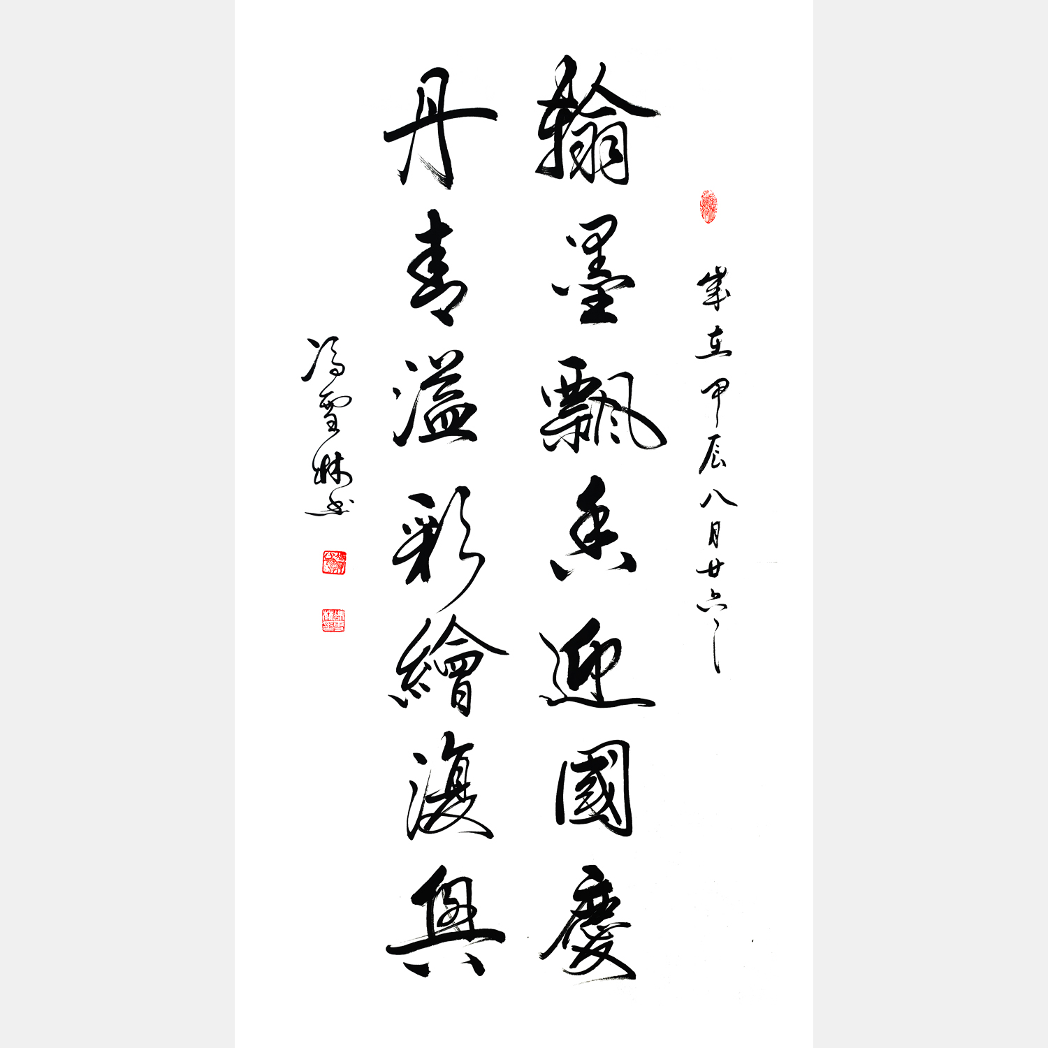 書法內(nèi)容:翰墨飄香迎國(guó)慶,丹青溢彩繪復(fù)興。