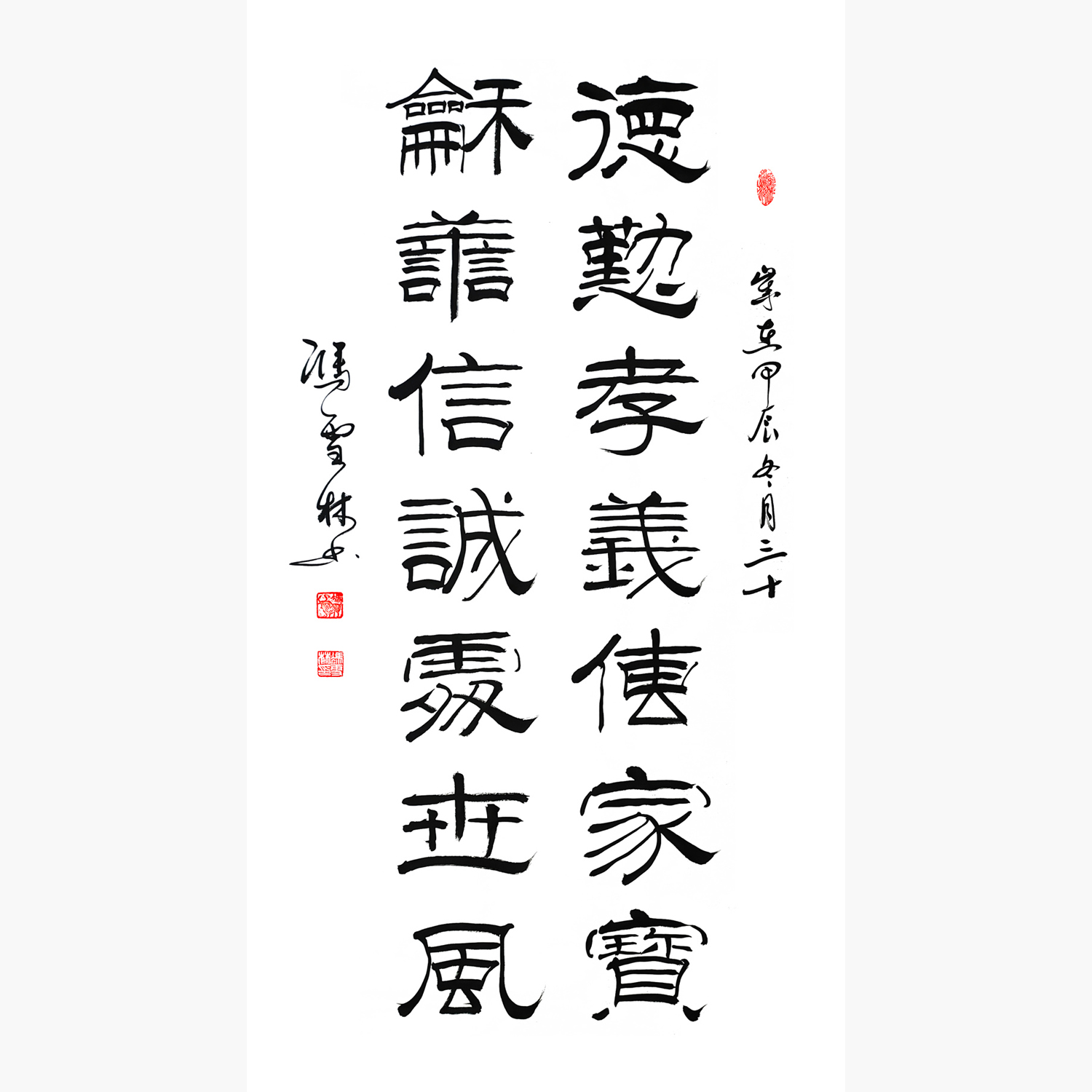 書(shū)法內(nèi)容:德勤孝義傳家寶,和善信誠(chéng)處世風(fēng)。