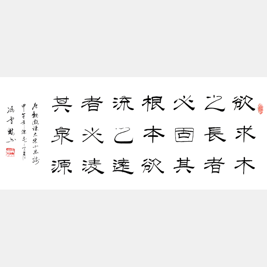 字畫內(nèi)容:唐·魏征《諫太宗十思疏》名句。欲求木之長(zhǎng)者,必固其根本;欲流之遠(yuǎn)者,必浚其泉源。
